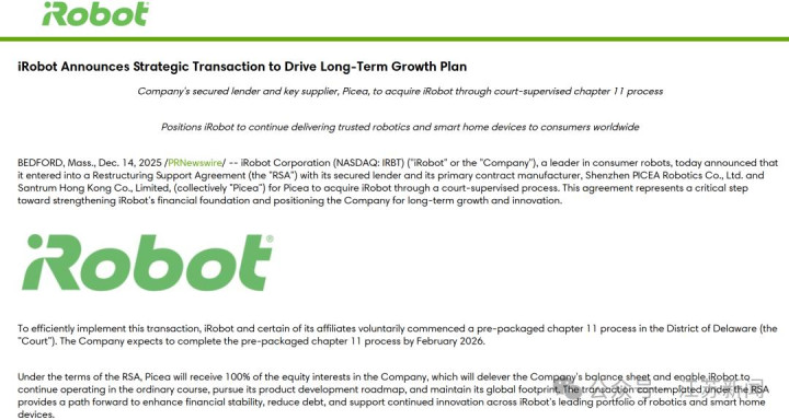 iRobot在公告中宣布,已经向美国特拉华州法院提交第11章破产保护申请,并与主要债权人、主要供应商Picea(深圳杉川机器人和香港杉川,后文统称为杉川)签署重组支持协议,由杉川通过法院监督程序收购iRobot。公司预计将在2026年2月前完成破产手续。